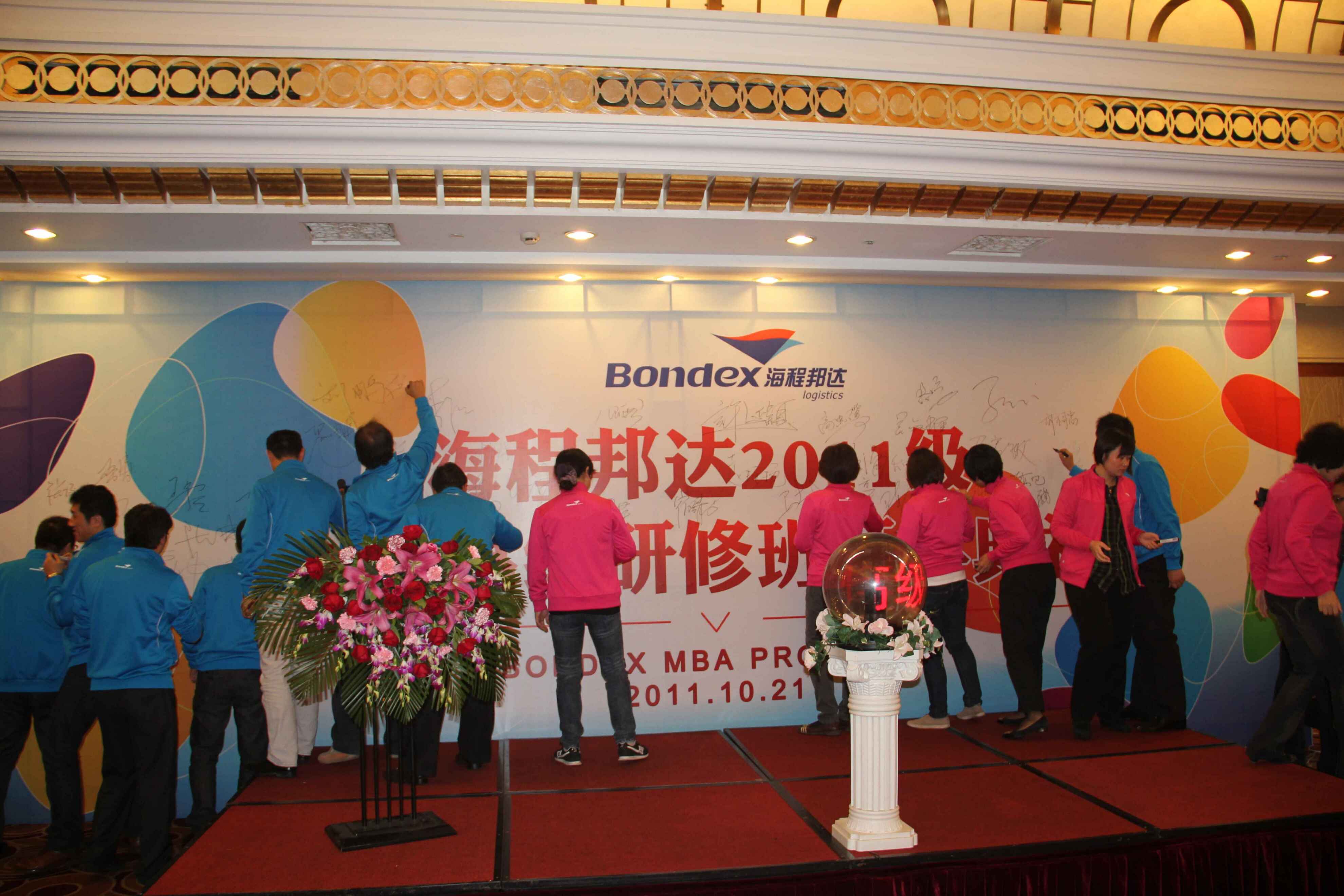 海程邦達MBA班開學典禮暨首次課程于2011年10月21-23日期間在青島舉行,公司領導唐總、高總、張總、吳總、馬總及本項目承辦單位眾拓灌能咨詢公司許董等人出席了開學典禮儀式,來自公司各部門及各分公司的五十余位學員參加了典禮。21日上午8時30分,開學典禮在大家的熱切期盼中拉開了帷幕。首先項目總負責人、公司總裁唐海先生就公司發(fā)展目標及干部培養(yǎng)計劃做了鼓舞人心的講話,緊接著許董、高總兩位教務督導分別就項目師資、服務保障做了介紹,并表達了對學員的要求和期望。在熱烈的音樂氛圍中,唐總、許董、高總共同啟動了水晶球,宣布海程邦達2011級MBA高級研修班正式啟動。隨后,唐總公布了由學員投票選舉產生的班委會名單,并將班旗授予班長路鳴;路鳴手持班旗帶領全體學員莊嚴宣誓:“... ...虛懷若谷,學以致用;勇于迎接更高的挑戰(zhàn)!”