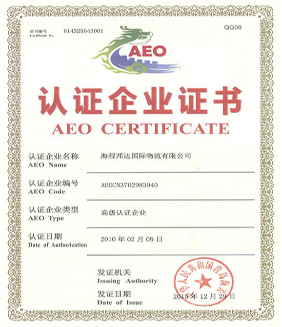 2015年12月,海程邦達(dá)國際物流有限公司(海關(guān)注冊代碼3702983940)通過青島海關(guān)的“高級認(rèn)證企業(yè)”審核,正式獲得《高級認(rèn)證企業(yè)證書》。