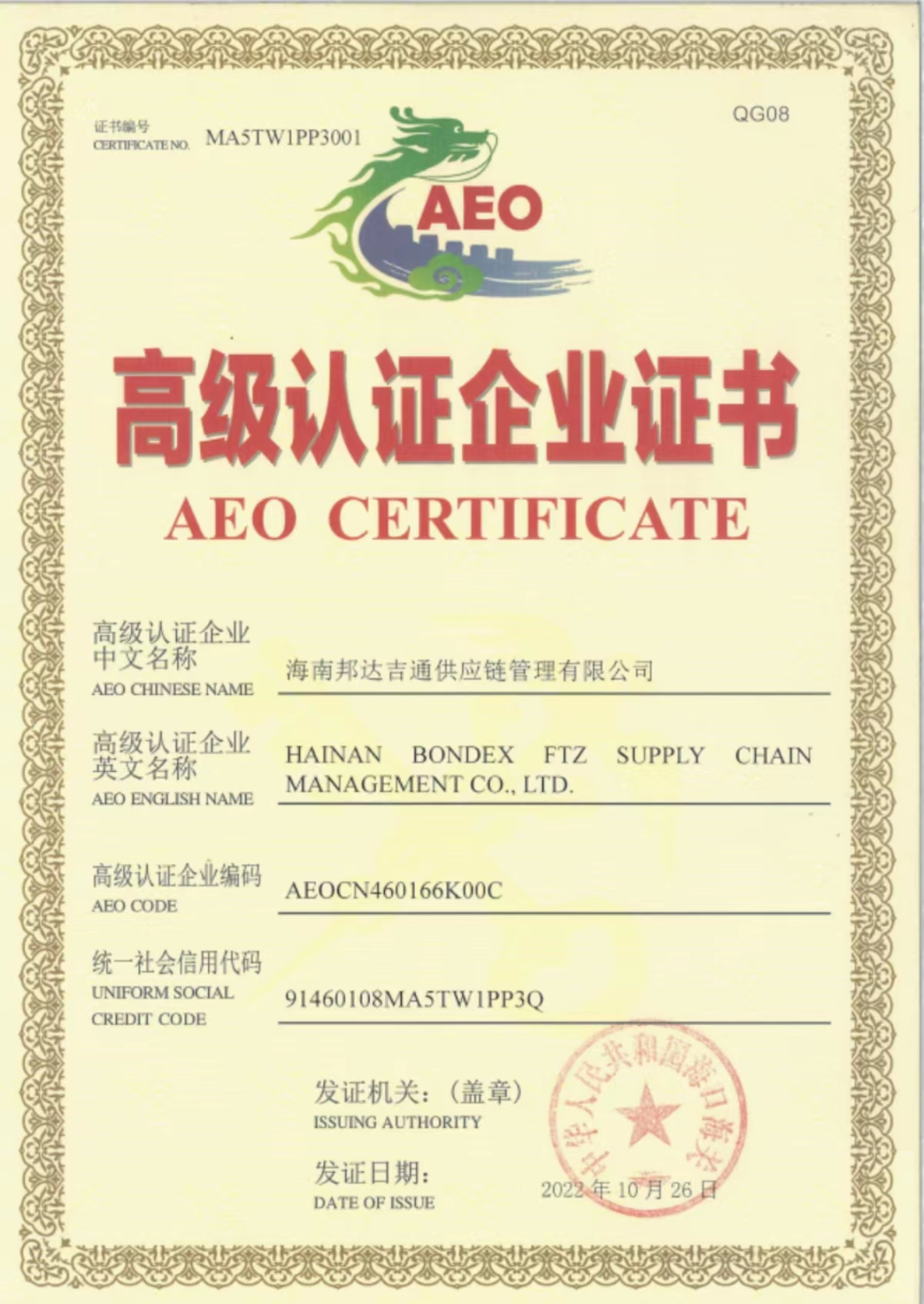 2022年10月26日,海口海關(guān)向海南邦達(dá)吉通供應(yīng)鏈管理有限公司頒發(fā)了“海關(guān)AEO高級(jí)認(rèn)證企業(yè)”證書(shū)。