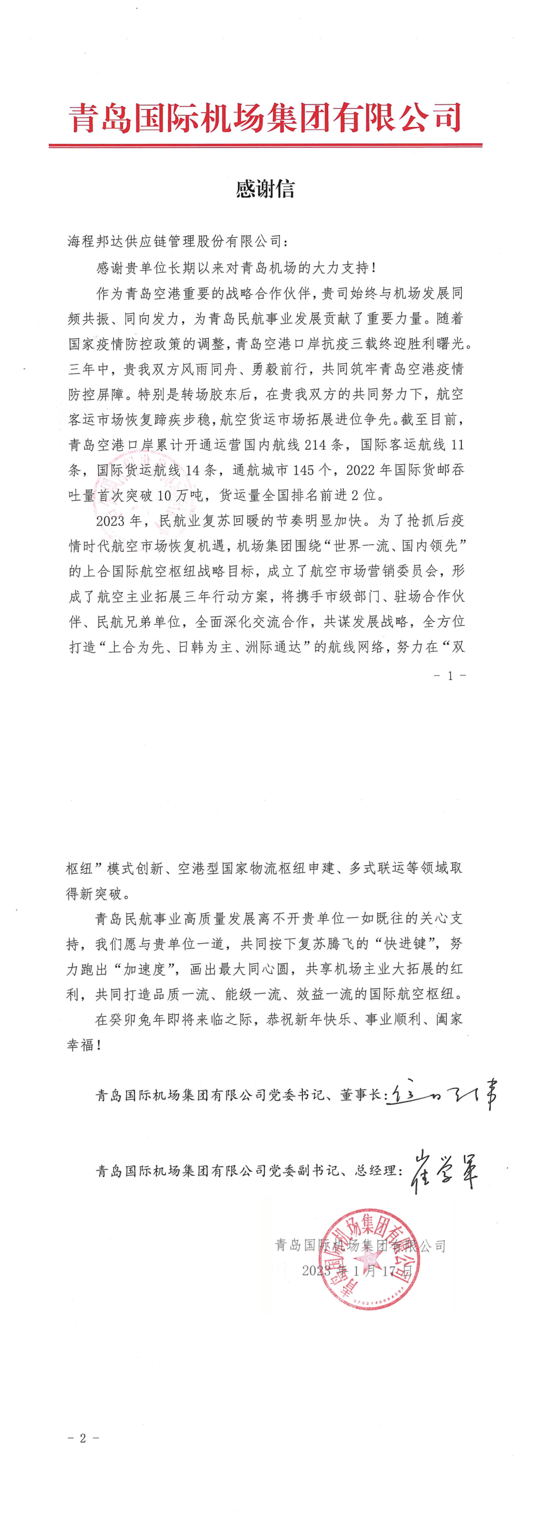 歲末年初,海程邦達收到了一封來自青島機場的感謝信。這封感謝信寫出了對我們專業(yè)、高效服務(wù)品質(zhì)的認可和肯定,充滿雙方精誠合作、砥礪前行的勇氣和力量,這封感謝信更是激勵我們不畏艱難、奮勇前進的不懈動力。自2021年青島空港轉(zhuǎn)場膠東以來,海程邦達整合資源,匯聚優(yōu)勢,精耕細作,搭組織,強產(chǎn)品,重承諾,抓效率,憑借集團網(wǎng)絡(luò)和優(yōu)勢資源持續(xù)為青島空港的建設(shè)貢獻力量,打造了優(yōu)秀的產(chǎn)品和口碑。
